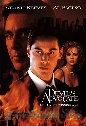 THE DEVIL'S ADVOCATE Dirección: Taylor Hackford, 1997 Guión: Tony Gilroy (basado en la novela de Andrew Niederman) y Jonathan Lemkin Música: James Newton Howard Intérpretes: Keanu Reeves, Al Pacino, Charlize Theron, Jeffrey Jones Devils Advocate, donde Reeves