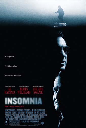 Dirección: Christopher Nolan, 2002 Guión: Hilary Seitz (basada en la pelicula Insomnia de Nikolaj Frobenius y Erik Skjoldbjaerg) Música: David Julyan Fotografía: Wally Pfister Reparto: Al Pacino, Robin Williams, Hilary Swank, Maura Tierney Christopher Nolan, autor de la invaluable